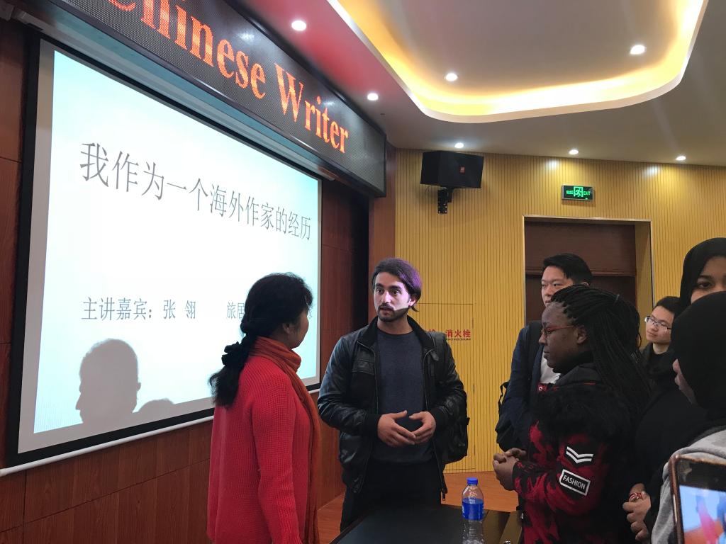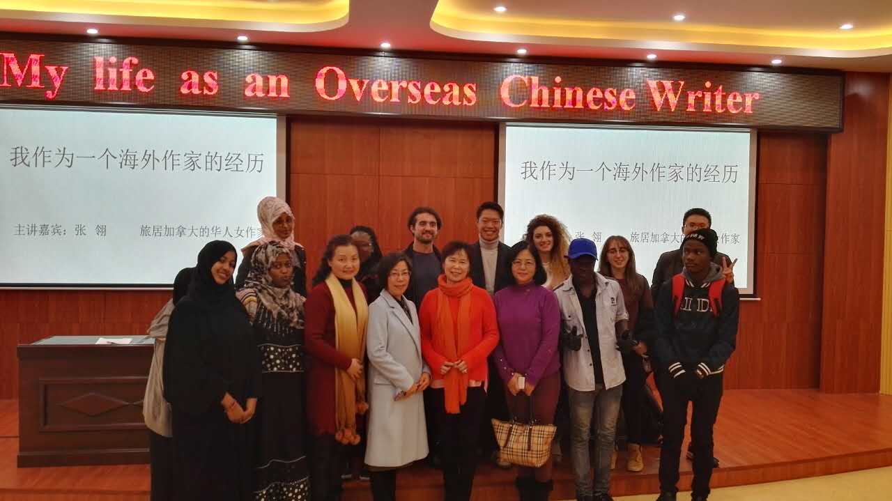 张翎的讲座风趣幽默、娓娓道来,她从“追梦”、实现“作家梦”的心路历程讲起,介绍了自己一路走来的人生经历,讲述了电影《唐山大地震》原作小说《余震》的创造灵感和过程,以及《唐山大地震》上映前后生活上带来的不同变化。讲座中,张翎还朗读了自己的最新力作、长篇小说《金山》的片段。她的朗读声情并茂,令在场师生仿佛身临其境,切身感受到小说主人公的喜怒哀乐和所感所思。在交流环节,中外学生发言踊跃。有人问“您是否将《余震》作为自己作家生涯的巅峰?”张翎坚定地回答:“我一生的兴趣和梦想就是成为作家,所以我不会停止,我会一直创作直到生命的尽头。”意大利籍交换生MARTIN说:“我的梦想也是成为一名作家,张翎老师的倾情分享启迪我应该找回自己最初的梦想,同时要为实现这个梦想坚持不懈。”