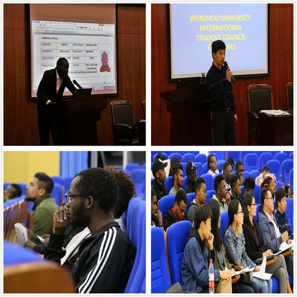 为了进一步提高国际学生自我管理、自我服务、自我教育的意识,让来华国际学生更好地融入学校,促进中外学生交流,发挥国际学生学生会组织的“桥梁纽带”作用,在留学生教育与管理部指导下,经过为期两个月的筹备、报名、面试、主席团候选人竞选演说和选举,最终确定了由CHIWESHE NATALIE等27名国际学生组成的首届国际学生学生会(WZU International Student’s Representative Council),加纳籍2016级软件工程专业研究生ADOFO MICHAEL ADJEI当选首届国际学生学生会主席。