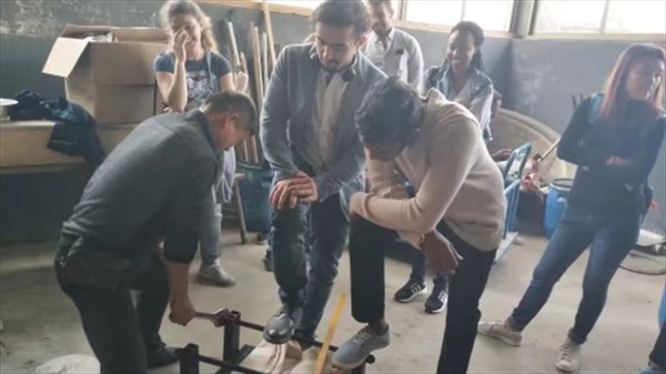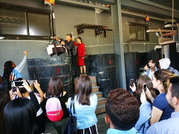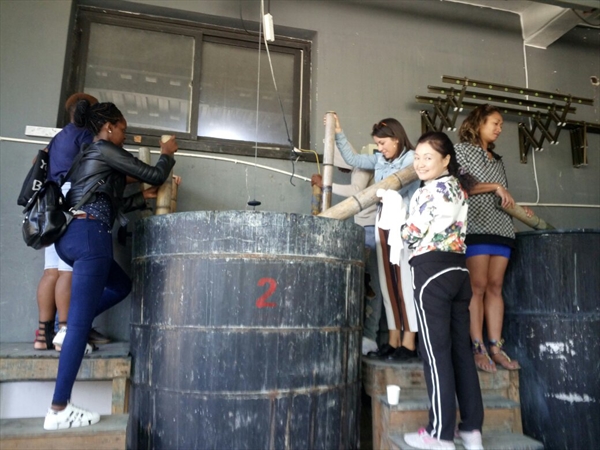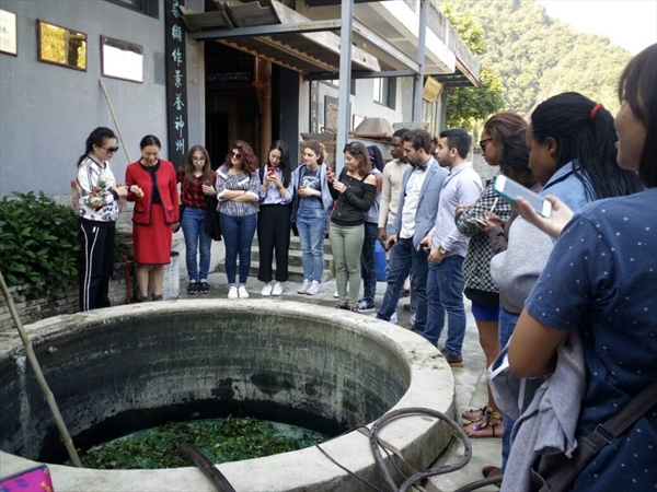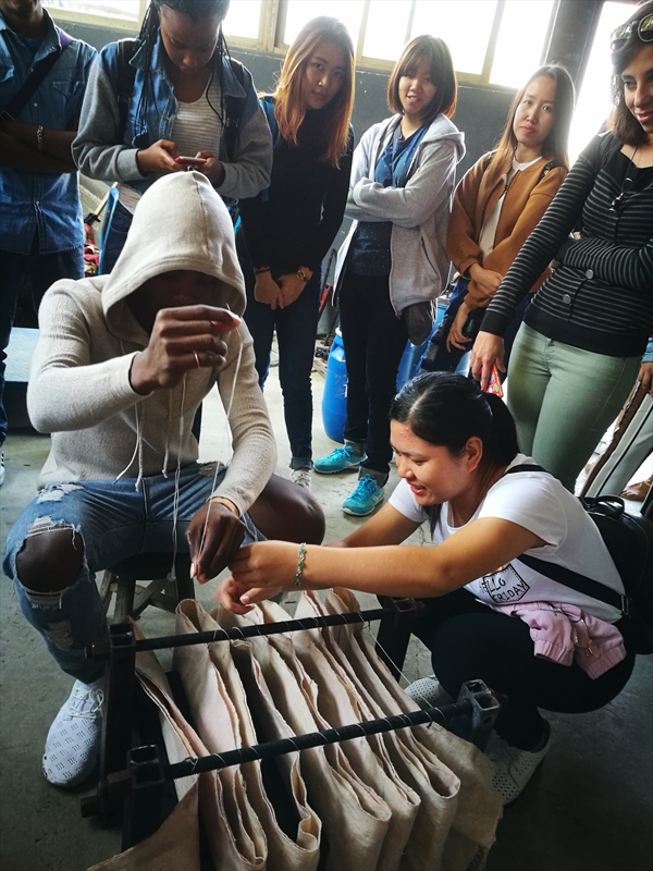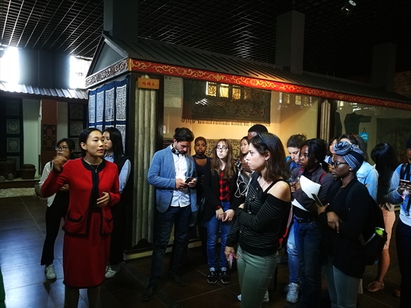 大家一起参观了染坊、展示厅、管理房。在展示厅展出的实物有生态燃料、古代熨斗、各种图案的染布、织布机、雕板等展品,这些展品有出自汉代、清代、民国、现代等,制作蓝夹缬的师傅亲身示范怎样做蓝夹缬,用的夹版图案是取自戏曲《西厢记》。看着师傅用夹版一层一层地把布夹起来,留学生们也跃跃欲试和师傅一起完成夹布的工作,接下来就是固定了,固定是需要很大力气的,男生们为了表现自己都使出了九牛二虎之力帮助师傅固定好夹版。NOKA MARTIN(阿尔巴尼亚)开玩笑地说“师傅雇了三个劳动力”。固定好之后为了防止布粘在一起,需要用针线把它穿起来,MBONU CHISOM HENRY(尼日尼亚)在师傅的帮助下成功完成了穿线任务,接下来就是放在染缸里染色了。时代在变,经济在发展,博物馆里染布也由原来的手工变成了机器操作。看着做好的蓝夹缬放入染缸大家都开心地去吃午餐了。