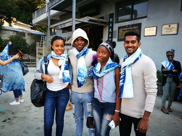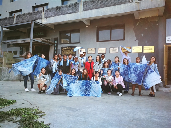 时间总是飞逝,不知不觉一天的行程即将结束。在留学生的欢声笑语中度过了这愉快的一天。临行之际,留学生们都恋恋不舍,纷纷戴上自己做的围巾和蓝夹缬非遗博物馆的人员合影留念。此次蓝夹缬博物馆之行也进一步激发了留学生对中国非物质文化的兴趣。