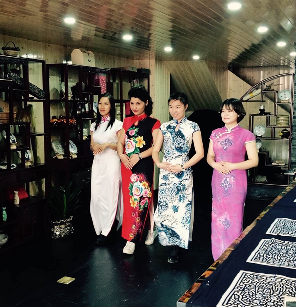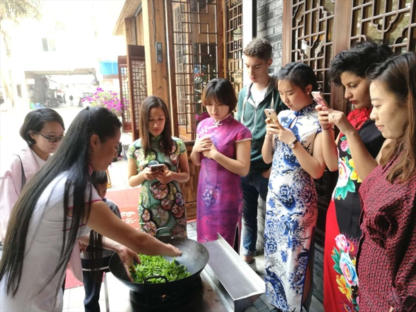 茶叶揉捻完毕后,还要经过一段时间的晾晒干燥,在这过程中,留学生换上了旗袍,跟着老师学起中国淑女的妙曼走姿,在这悠悠春日中,瞬间绽放了绰约芳华。