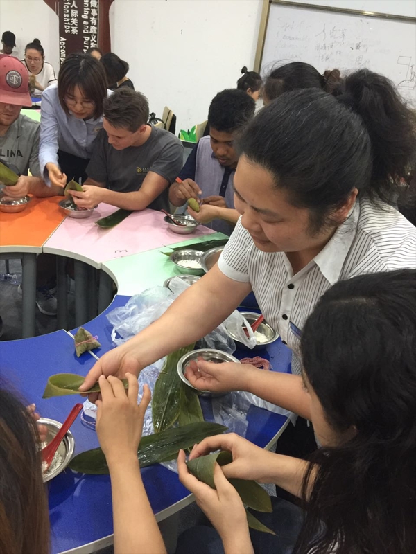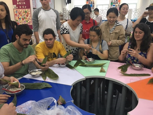 中外师生和来校交流的美国阿帕拉契大学师生80多人齐聚幸福工坊,学包粽子、绘彩蛋、结五彩绳、学书法、赏茶道,体验中国端午传统文化。