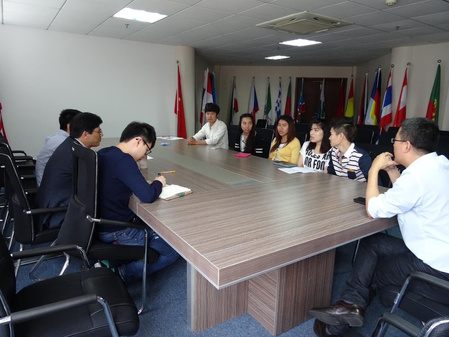 市场营销(中丹项目)、电子信息工程(两岸项目)专业学生代表座谈会之后,2013-2014学年第二学期留学生学生代表座谈会在专家楼304会议室顺利召开。学院教学副院长陈军、教学科副科长黄呼尔励、学生科副科长陈赞安、学院留学生代表以及其他相关老师出席座谈会。会议由教学科副科长黄呼尔励老师主持召开。