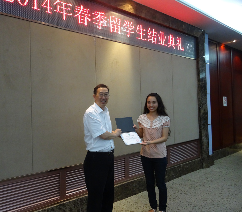 2014年春季留学生结业典礼于6月25日在南校区岩松堂白鹿厅举行,国际合作学院院长严晓鹏、党总支书记朱建平出席典礼,全体结业留学生和部分教师参加,典礼由副院长陈军主持。