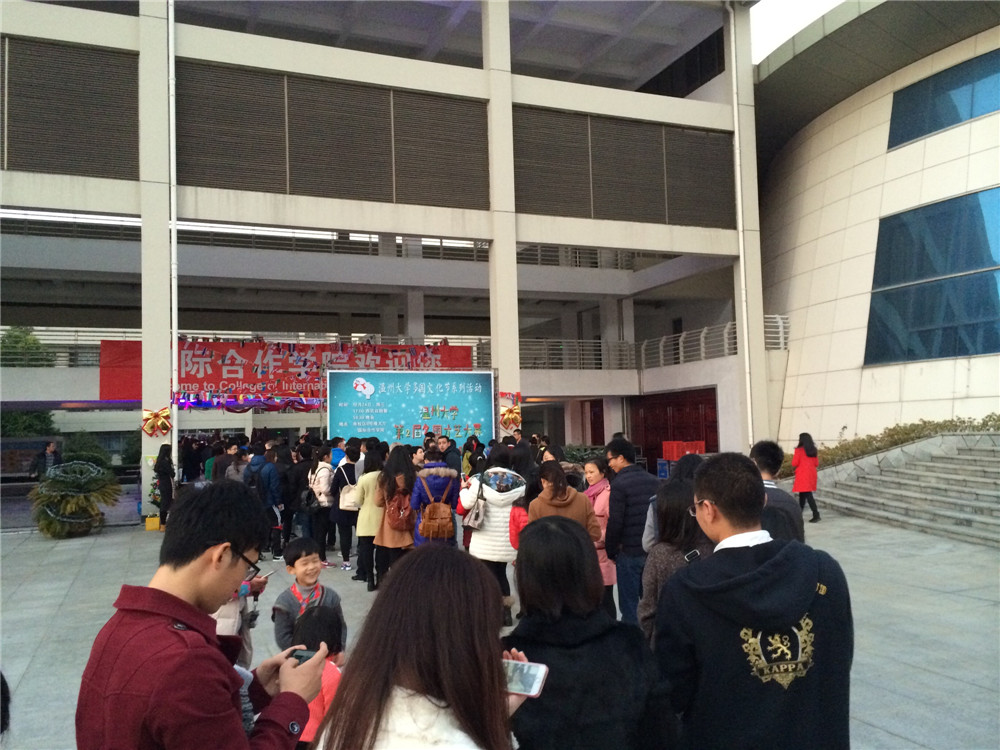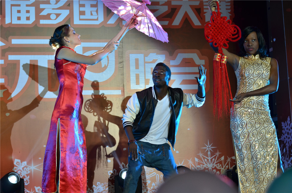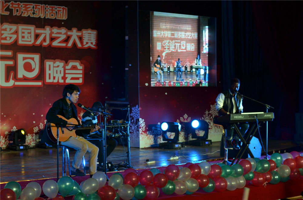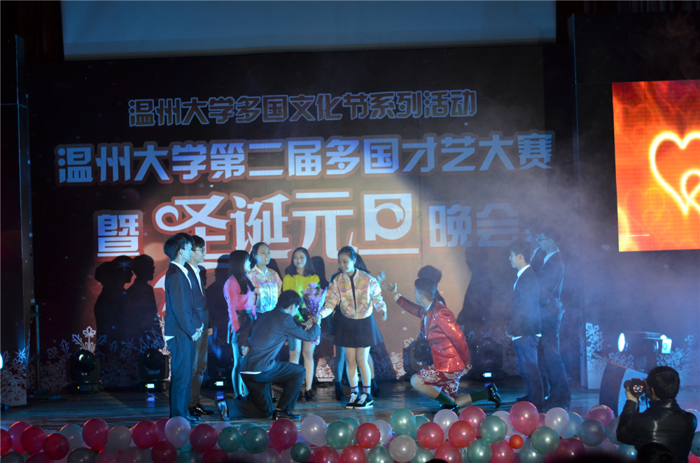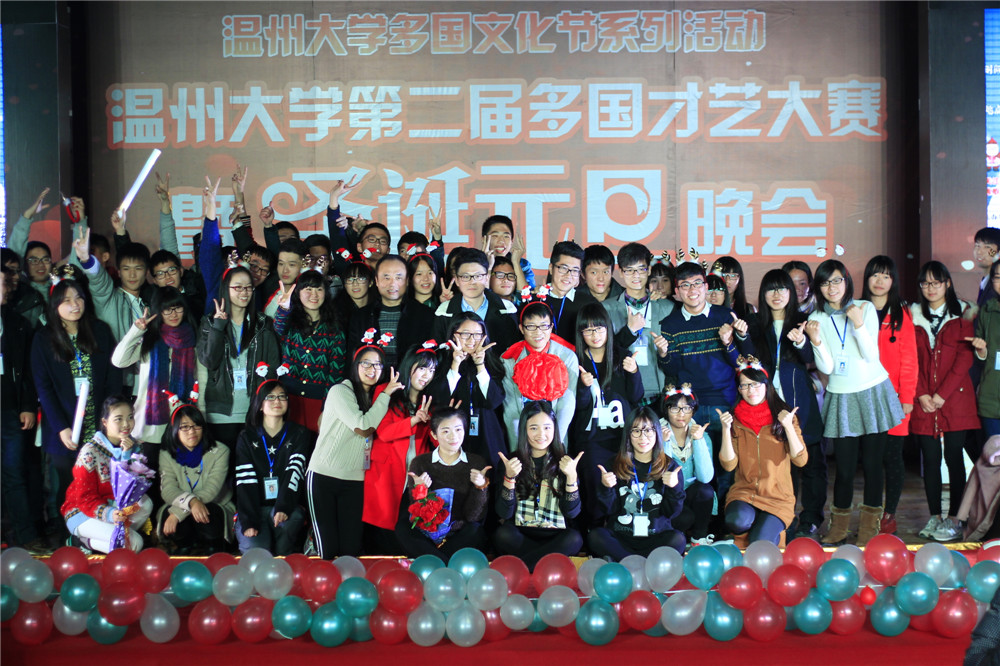 多国文化节系列活动暨2014圣诞元旦晚会。晚会形式多样、精彩纷呈,异域风情与中国传统艺术突显了文化交融的和谐主题。中外合璧的主持人阵容亦是晚会的一大亮点,来自俄罗斯的主持人喀秋莎成为晚会现场一道亮丽的风景。晚会在热情奔放的开场舞中拉开帷幕,随后精彩的节目轮番上演,舞蹈串烧《Hot Christmas》、《江南style》及新颖的荧光舞充满激情,调动了大家的热情,驱赶了冬夜的寒气;精彩且略带幽默的魔术让现场笑声惊叹声此起彼伏;来自俄罗斯、西班牙、意大利、泰国、加纳等国家的13名留学生参演的舞蹈《我的中国范儿》将晚会推向了高潮:西洋味十足的爵士舞步,中国韵浓郁的曼妙旗袍,江南水乡特有的油纸伞,温州本土特色的节奏饶舌,舞蹈以巧妙的形式将西洋风、中国范、江南韵、温州味融合在一起,加上留学生们娴熟精妙的舞步,不禁让人眼前一亮;非洲留学生和泰国留学生的乐队表演,深情献唱,引发现场观众的共鸣,赢得阵阵掌声;晚会中穿插互动小游戏,现场观众参与踊跃,大家玩得不亦乐乎,气氛极其热烈。