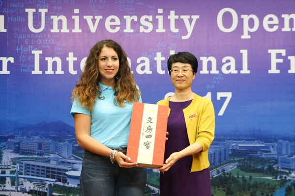 林娟娟、方益权为国际新生代表佩戴校徽,赠送“文房四宝”。全场新生同时佩戴,现场气氛热烈,极大地增强了国际学生的归属感和荣誉感。