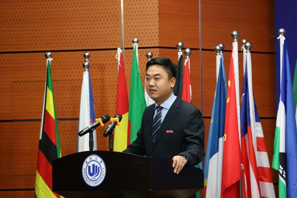钱强致辞。首先,他代表学校向来自5大洲53个国家和地区的279名国际新生表示热烈的欢迎。同时,他还介绍,温州是中国民营经济的先发地区与改革开放的前沿阵地,创造了举止瞩目的“温州模式”;温州人敢为人先、商行天下,近70万人在世界131个国家和地区、近200万人在中国各地经商创业,拥有“东方犹太人”的美誉;555电影