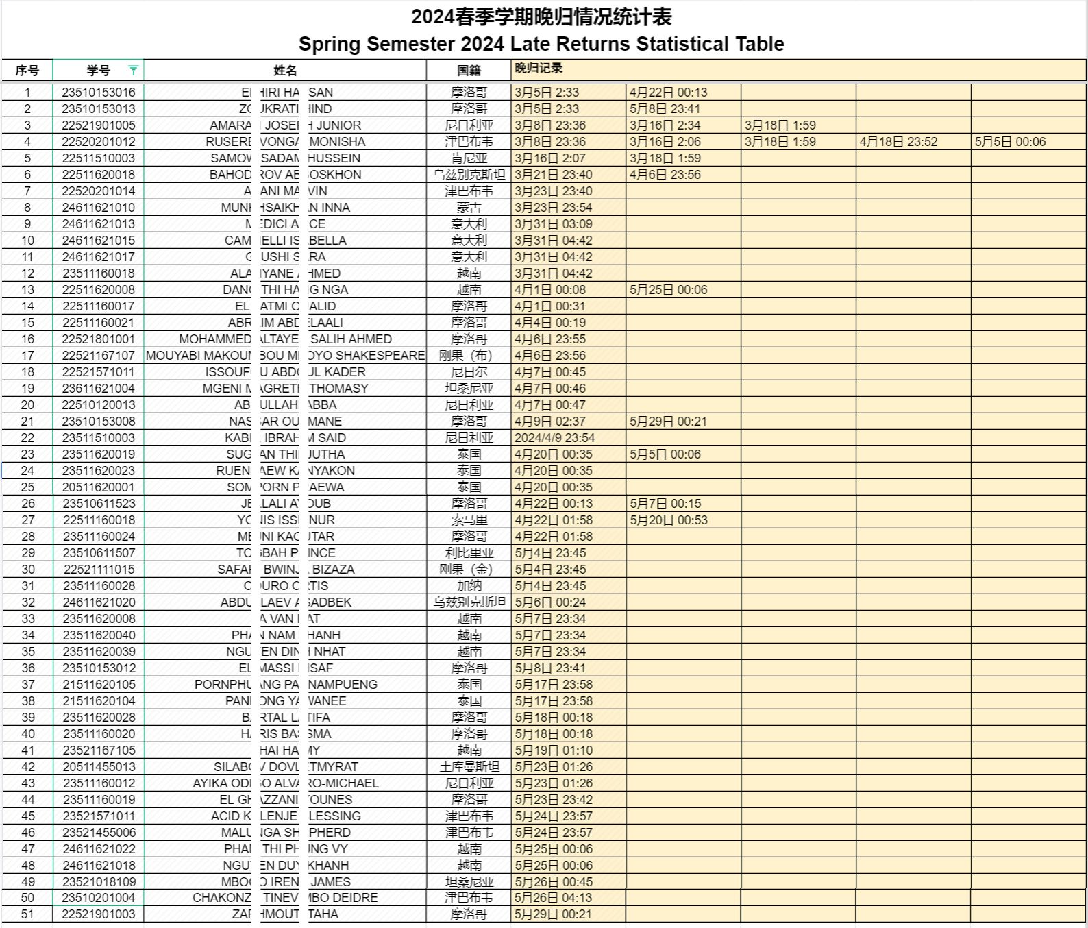 The students in the following list have returned late many times since the beginning of this semester, and the college has decided to publicly criticize them, among which two students, AMARAN JOSEPH JUNIOR and RUSERE VONGAI MONISHA, have been given warnings in accordance with the provisions of the disciplinary regulations of the international students of Wenzhou University (Revised in 2020), Chapter 2, Article 24, Point 5. We hope you will take this as a warning.