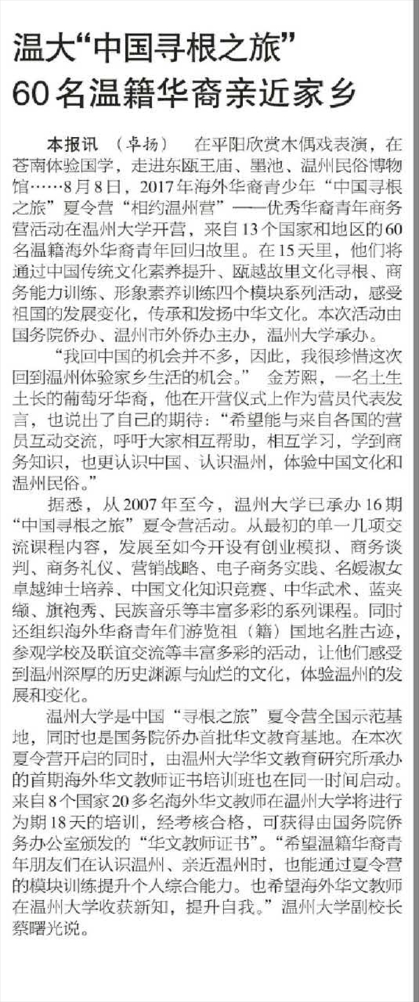 温州文明网:“中国寻根之旅”优秀华裔青年商务营温州开营
