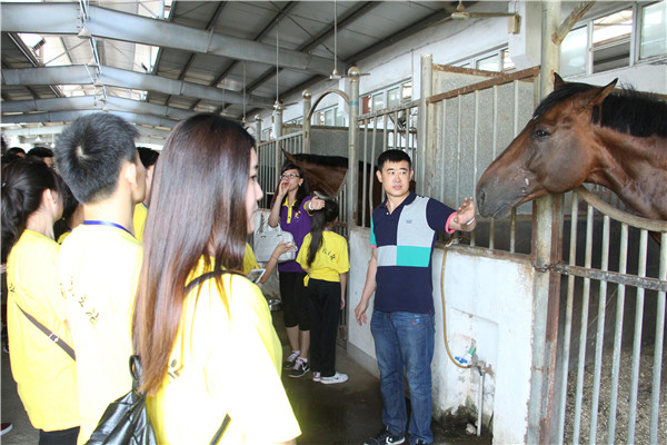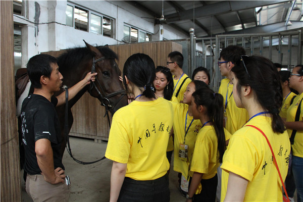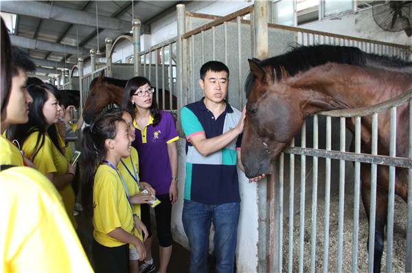 凯易路马术俱乐部是浙江省目前规年模最大,设施最完善的马术专业训练场所。在专业马术教练的带领下,营员们首先来到马棚参观,教练向营员们介绍说:“马场的马都是血统纯正的,这也保证了它们高大威猛的体态和完美的奔跑跨越能力,这样的马甚至可以轻松的越过两米高的障碍物。马都是经过专业训练的,别看它们这么高大,其实都很温顺,很乐意与人们亲近。”营员们不禁轻抚马匹油亮的皮毛,与名驹合影,喜爱之情溢于言表。