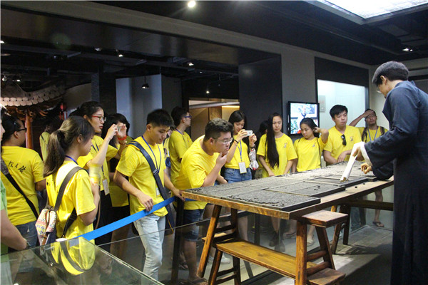 在讲解员的带领下,营员们首先参观了温州各个县市区的传统特色非遗文化。乐清细纹刻纸图案细如发丝,艺人能在一寸的纸上刻出52根线条;瓯海的百鸟灯是彩纸做成的不同种类的鸟模型花灯,每只鸟灯上还要配诗一首,泰顺的廊桥,结构精巧,工艺精湛;瑞安木活字印刷完整地再现了中国古代活字印刷的传统工艺,营员们感叹古人的别出心裁,多才多艺。接着营员们又参观了夹缬馆、龙舟馆、瓯窑馆三个专题馆。馆中的“非遗”瑰宝通过图表、照片、实物、模型等多种形式生动地展现在营员们的面前:蓝白相映的夹缬,美轮美奂的龙舟、巧夺天工的黄杨木雕,金碧辉煌的玉雕孔庙……营员们不时发出阵阵惊叹声。
