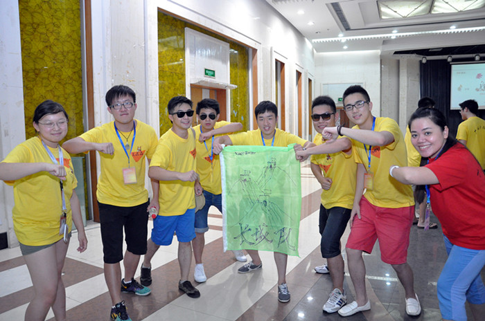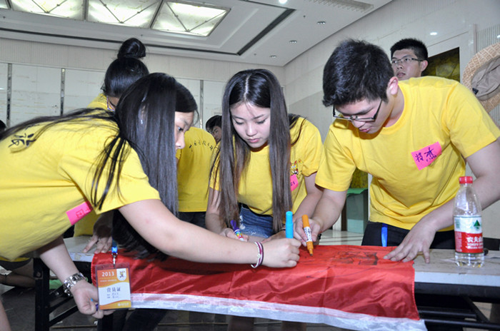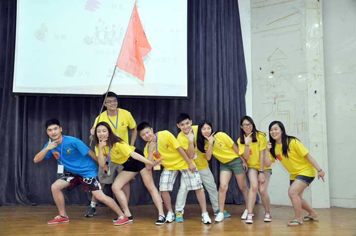 的老师们为营员们精心准备了团队建设实践课程的各个环节。第一个环节是“团队组建”,全体营员组建成6支队伍,每支队伍选出队长一名、队秘一名,确定各队响亮、有气势的队名、队号和队歌,并在队旗上画上醒目的队徽。最后,每支队伍要上台展示自己的队伍,并摆出团队造型定格10秒。通过这一环节,营员不仅熟悉了自己团队中的各个伙伴,也对其他队伍中的队员们有了了解。接下来的环节就是6支队伍间的PK较量了,通过“帝国战车”和“支援前线”两个环节,队员们相互协作,各队间激烈交锋,每一位营员都亲身体会到与队友紧密合作,为团队贡献力量的成就感。