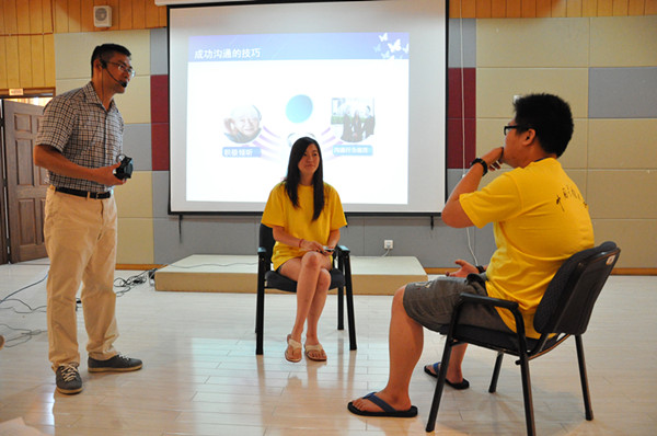 讲座伊始,毛老师进行了一个人际交往小实验,他从营员们当中挑选了3对互相比较不熟悉的营员,让他们扮演第一次见面的两个陌生人,保持一段5分钟的对话不中断。实验的结果出乎营员们的预料,没有一组能够成功完成对话,这让营员们不禁对接下来的课程内容充满了期待。