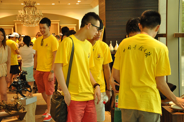 营员们一下车,便看到一座极具时尚感和现代感的大楼耸立眼前,走进红蜻蜓总部大楼,大厅里悬挂着的几百只水晶红蜻蜓瞬间吸引了营员们的目光,大家纷纷拿出手机、相机拍照。营员们首先参观的是红蜻蜓的品牌高端定制店,来自意大利的几位营员边看边将这里的运作流程和精美鞋样与意大利的一些高端鞋类定制店进行比较,不禁感叹,家乡的鞋企国际化水平也已非常之高。