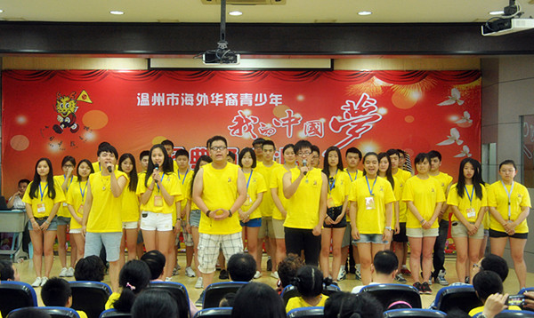 7月25日下午,2013“中国寻根之旅”夏令营温大分营——优秀华裔青年营的营员们来到温州市实验中学,参加由温州市人民政府侨务办公室主办的温州市海外华裔青少年“我的中国梦”经典诵读比赛。赛场外烈日炎炎,赛场内热情似火,来自温州地区7个夏令营分营的华裔青少年们齐聚一堂,为各自分营的参赛选手加油助威,并为在座嘉宾和观众献上精心准备的集体节目。