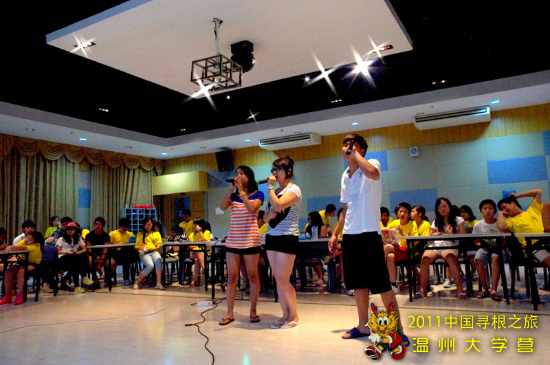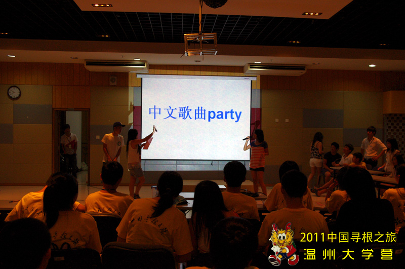 在熊海林老师一首动感的摇滚歌曲声中,中文歌曲party活动正式开始,大家都跟着节拍,激情地跟唱起来。随后来自法国、意大利、西班牙等国家的营员们纷纷登台献艺,给大家带来了《黑色毛衣》、《一千年以后》、《朋友》、《大海》这些耳熟能详的中文歌曲。在随后的拉歌比赛和猜歌词比赛,更是把整个活动推向了高潮。整个party活动中,营员们兴致高昂,激情四射,活力无限,不断地赢得了台下观众一阵又一阵的掌声,大家充分享受了中文歌曲给大家带来的快乐与刺激,度过了一个难忘而快乐的夜晚。