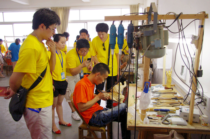 欣赏黄杨木雕和细纹刻纸等民间艺术作品后,三科集团的总经理叶胜国先生又为营员们详细介绍了三科集团的经营理念和555电影,并强调了民间力量保护非物质文化遗产的重要性,指出对于这些民间技艺必须有切实的保护和传承措施,这样才能一代一代的传承和延续!营员们对于叶总经理的讲话很有感触,提出了一些自己的理解和问题:黄杨木雕的价值在哪里?做这些举措的初衷又是什么?温州还有哪些民间艺术?三科集团未来还会采取怎样的措施来继续保护和发扬非物质文化产业?叶总经理对于营员们的问题一一耐心的作了详细解答!