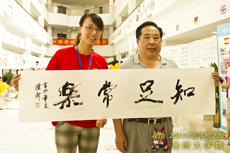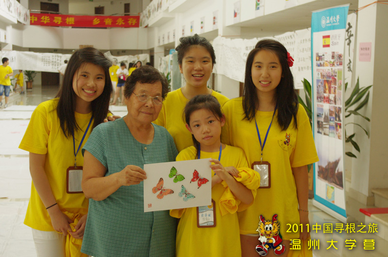 在高山流水的古筝声中,整个活动到处都充满了古色古香传统文化气氛。最后,温州市老年书法协会的老干部们,还赠送了书画剪纸作品等给营员们和海外华校教师培训班的学员们,并和大家一起合影留念。