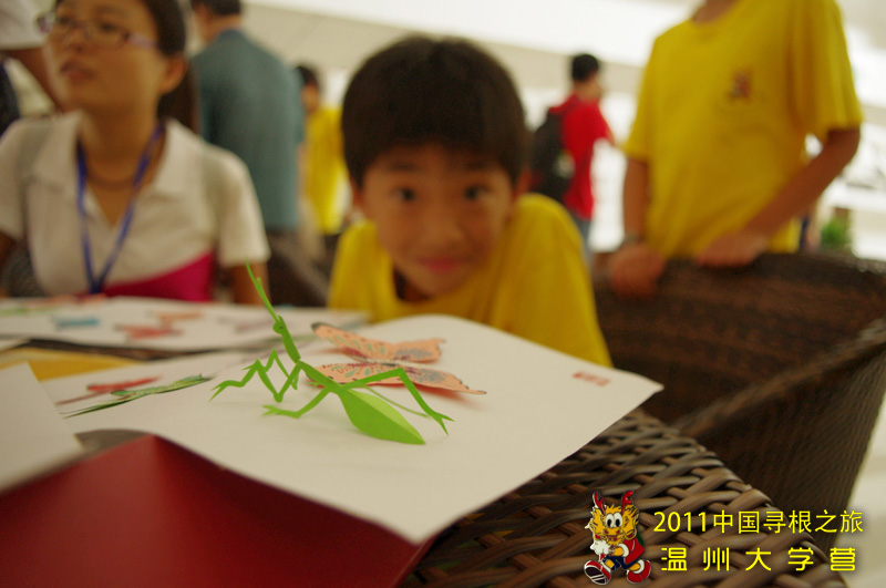 7月22日上午,温州市老年书法协会30多名退休老干部来到2011海外华裔青少年“中国寻根之旅”夏令营温州营温大分营的营地,对海外华裔青少年们进行书画展览和现场书画创作展示,让营员们感受到中国传统书画艺术的魅力。到场的除了营地85名海外华裔青少年,还有20多名海外华校教师培训班的学员们。