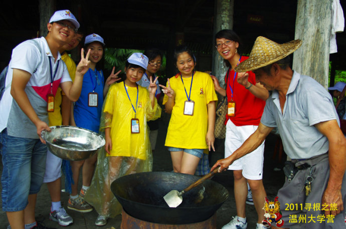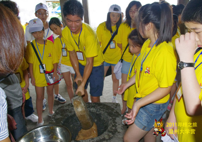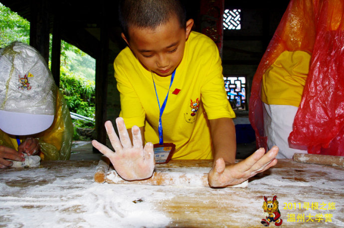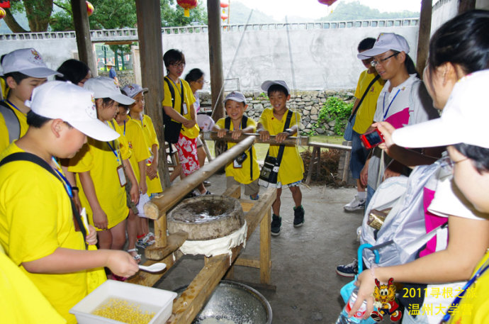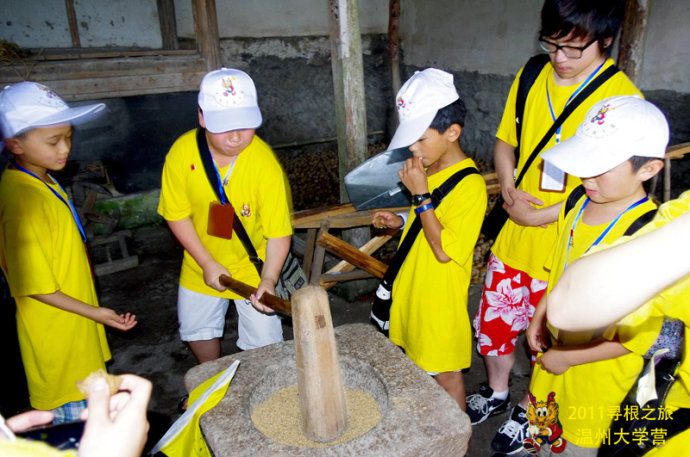 随后,营员们在老师的带领下,自己做麦饼、捣年糕、磨豆腐等传统瓯越农家生活,营员们非常开心,这真是一场难忘的经历,切切实实地感受到故乡的一风一俗,一景一致。中午,营员们还品尝了楠溪江农家菜。饭后,还体验了趣味农家生活,在荷池旁,在溪水里,在田地里,营员们摘着夏荷,闻着莲香,过着木桩,捉着河鱼,赶着山鸡,掰着玉米。体味着千年瓯越的“鱼戏莲叶的趣味,感受着“白云抱幽石,绿筱媚清涟”的山水之景。最后,营员们依依不舍地离开了楠溪江,结束了他们一天的瓯越文化之旅。随后的日子里,营员们还将游览江心屿,参观温州博物馆,继续这瓯越文化之旅。