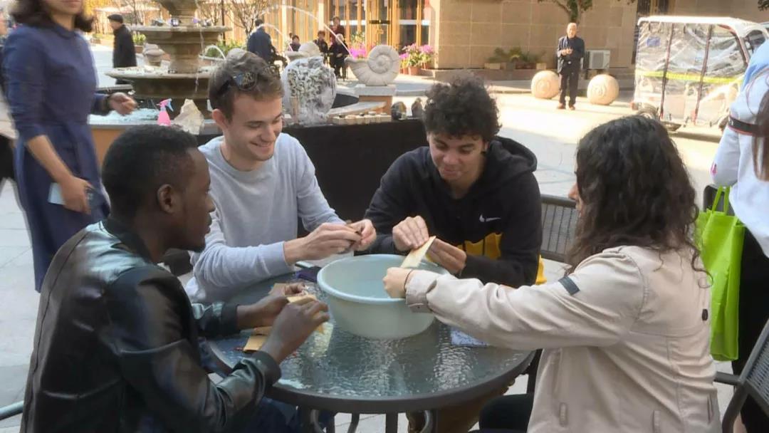 在海外人才创业示范街石雕艺术展示现场,玉壶镇邀请了意大利华侨石雕艺术家胡植柱、胡慧溪两兄弟,为国际生上了一节独具特色的体验课。