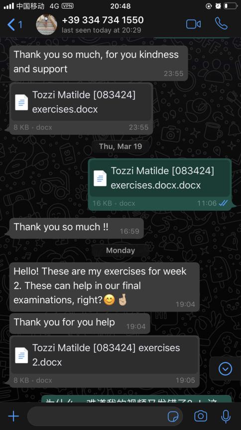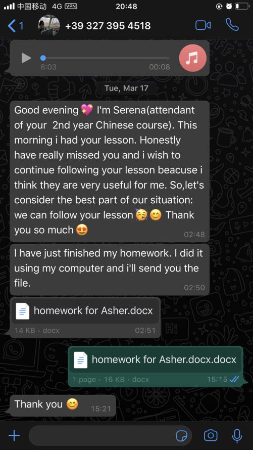 每一周,张珉璐都会精心把每个年级的两小时课程视频录制好,与音频、ppt、练习作业及一些额外的针对不同级别HSK的练习发送给意大利老师,意大利老师再上传至555电影