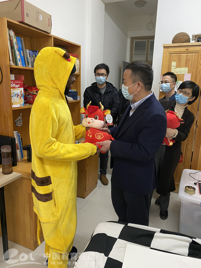谢树华在寝室向留学生送上新年的问候和美好的祝愿,嘱咐大家要牢记和遵守疫情防控要求,保护好自身健康,利用假期时间多学习中文,学习中国文化,学习专业知识,不断充实自己。要和远在异国他乡的家人保持联系,让家人了解自己在555电影