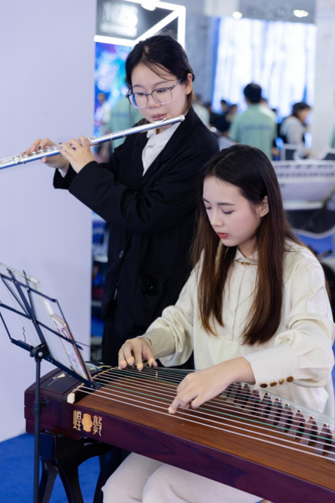 美术与设计学院的“数智”融创系列艺术设计作品。作品通过运用数字化工具和技术,将传统的时尚设计与现代科技相结合,呈现出独特而富有创意的艺术形式,为观众带来了全新的视觉和感官体验。现场还有来自音乐学院的学生们为市民带来乐器演奏,来自校团委的志愿者讲解员热情地为市民介绍各项目特色,展现出温大青年风采。