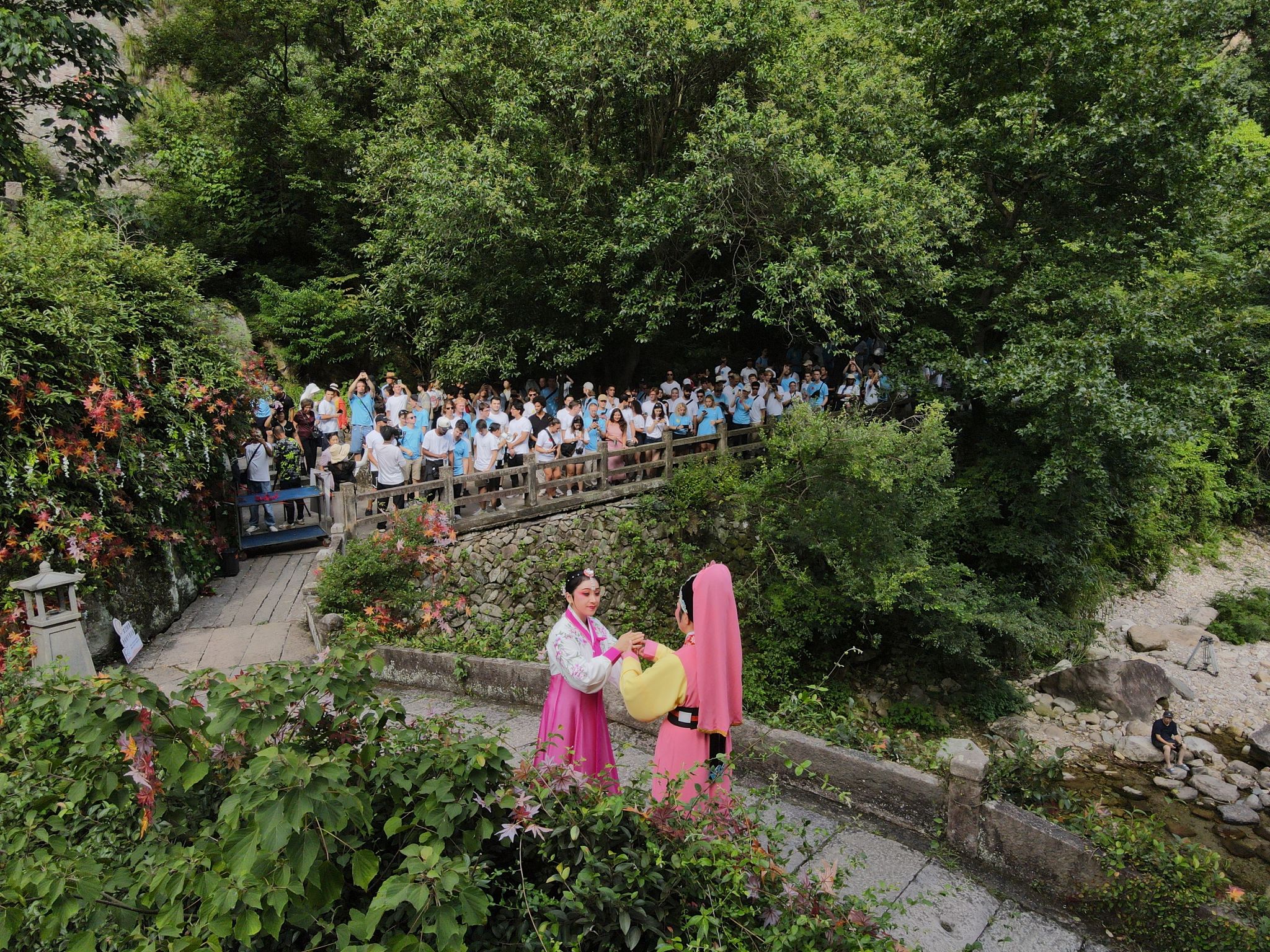 德国大学生在灵峰景区欣赏折子戏表演。周洪石 摄
