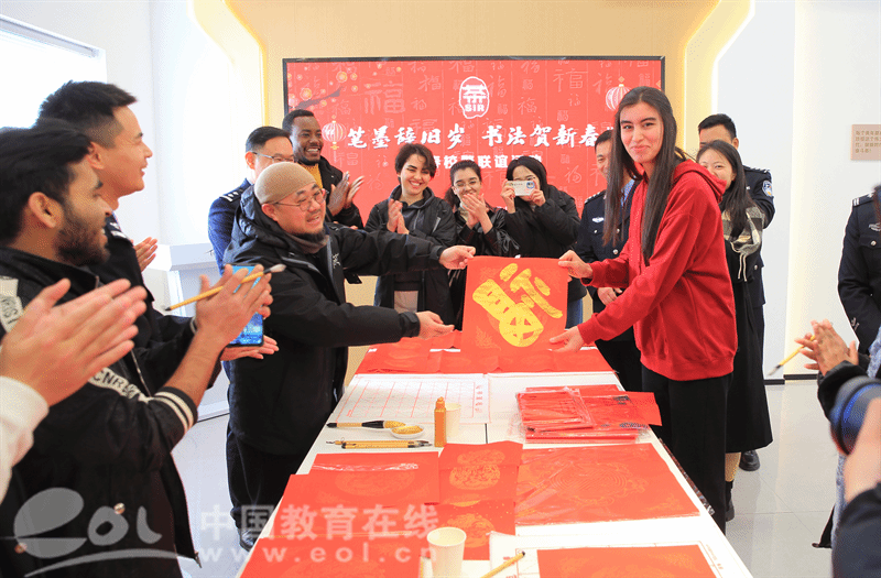 与茶山派出所共同举办了以“笔墨辞旧岁,书法贺新春”为主题的特色活动。活动现场,墨香四溢。在专业书法老师的指导下,留学生们兴致勃勃地拿起毛笔,蘸满浓墨,一笔一划地书写着“福”字和春联。他们虽然初涉书法,但每个人都全神贯注,力求将每一个字都写得工整美观。写完后,他们还纷纷展示自己的作品,脸上洋溢着满足和喜悦的笑容。