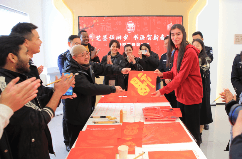 与茶山派出所共同举办了以“笔墨辞旧岁,书法贺新春”为主题的特色活动。活动现场,墨香四溢。在专业书法老师的指导下,留学生们兴致勃勃地拿起毛笔,蘸满浓墨,一笔一划地书写着“福”字和春联。他们虽然初涉书法,但每个人都全神贯注,力求将每一个字都写得工整美观。写完后,他们还纷纷展示自己的作品,脸上洋溢着满足和喜悦的笑容。活动后来自乌兹别克斯坦的留学生娜美感慨地说:“春联上的每一个字都蕴含着吉祥和美好的寓意,这让我深刻体会到了中国人对和谐、好运的追求。这次体验让我更加热爱中国文化了。”