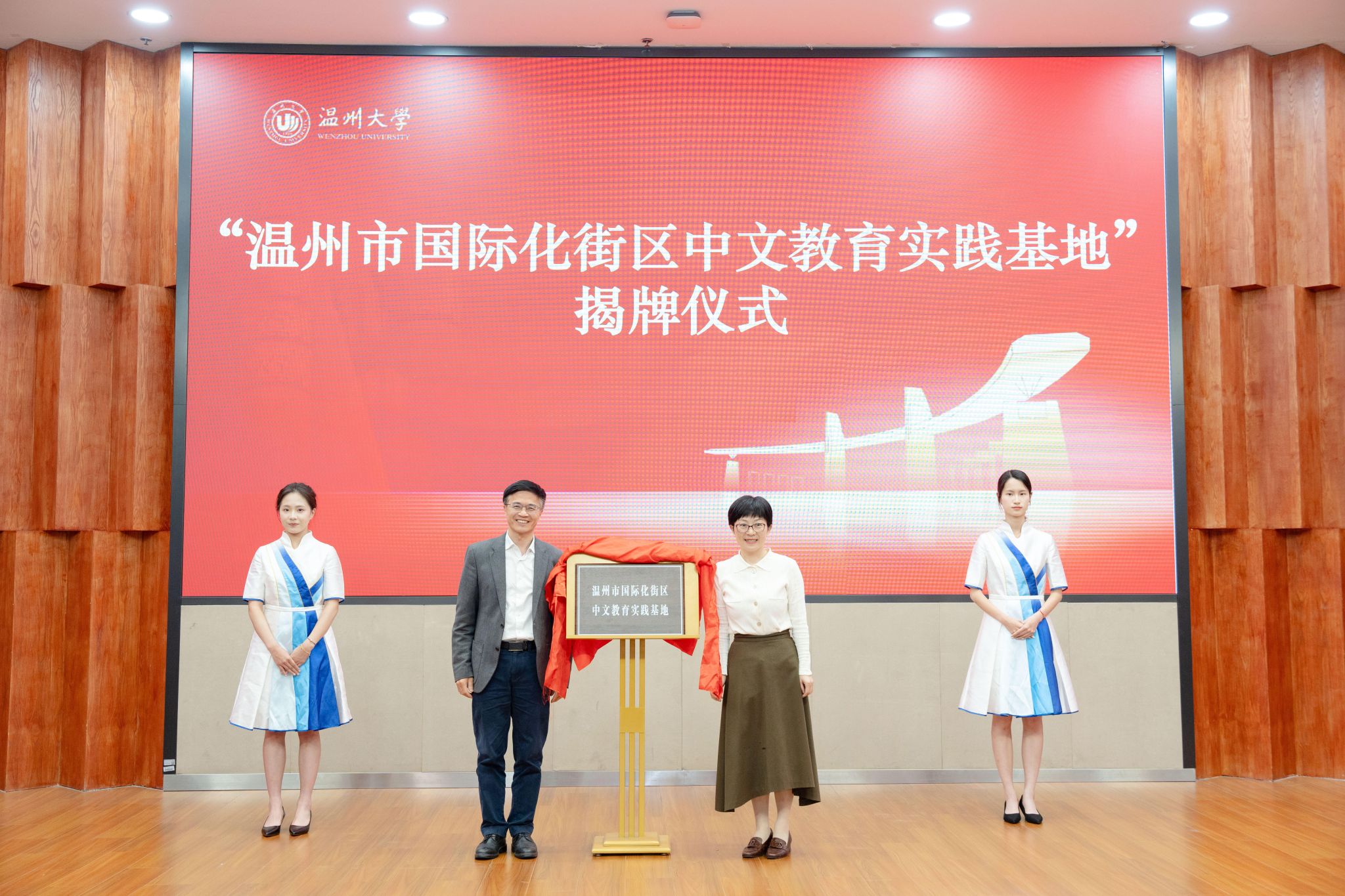 党总支书记林爱菊与温州市人民政府外事办公室副主任楼了凡共同为“温州市国际化街区中文教育实践基地”揭牌,标志着校地合作在推进国际化社区语言服务方面迈出实质性步伐。