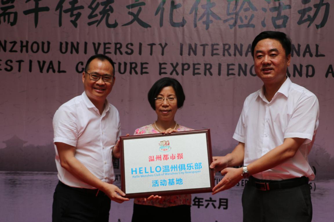 (留管部)院长兼党总支书记叶苗授“HELLO温州俱乐部”活动基地牌匾,为温州市民与在温外籍人士交流活动搭建了平台。