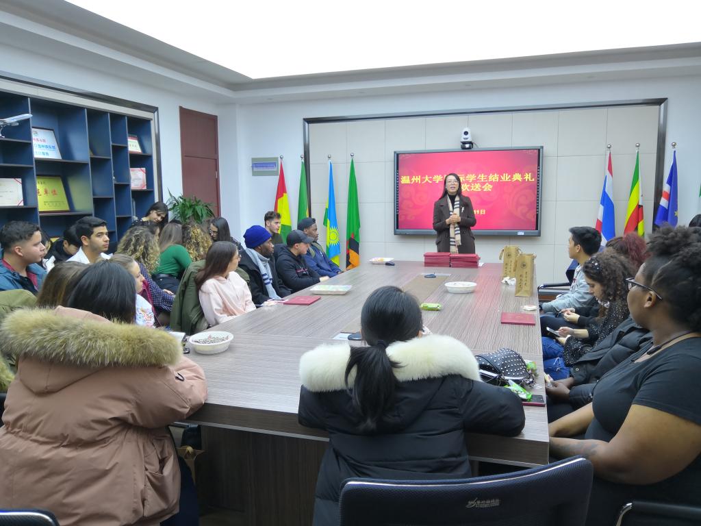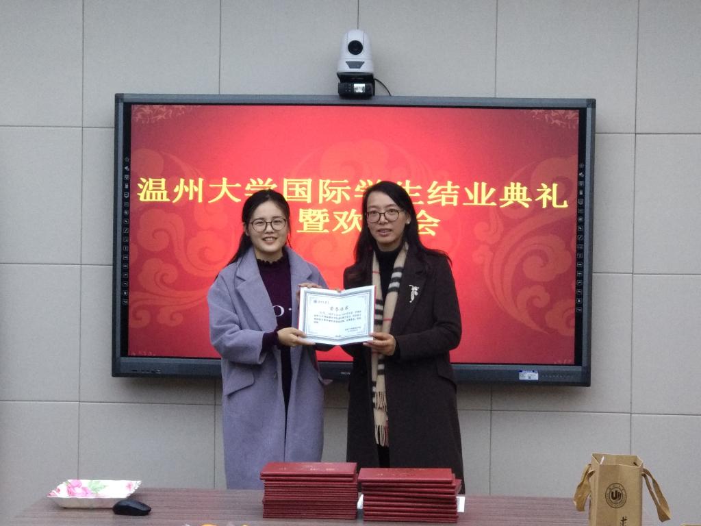 包含丽副院长为结业学生颁发结业证书和学院纪念品,为来自韩国、意大利、尼日利亚的结业学生颁发校友联络员证书,并为两位实习老师颁发“优秀实习教师”证书。她提到,希望各位校友联络员积极地与学校及各国校友联系,在自己的国家组织校友开展活动,将温大精神传播到世界各地。同时,她希望各位结业学生努力学习汉语,向自己的家人和朋友讲述中国故事,讲述在温大的故事。希望各位结业的“温大人”常回家看看,“555电影