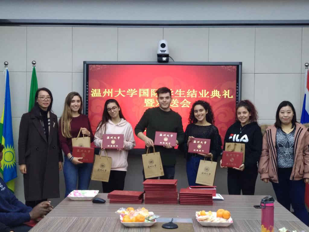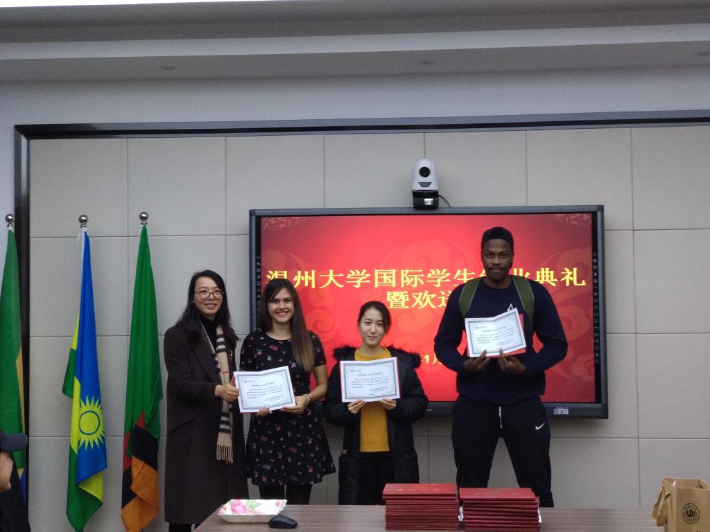 会上,张珉璐老师作为教师代表发言,她说,“很高兴在这里和你们相遇,并在这里共同成长,共同进步。”她列举了三个国外名人学习汉语的案例,激励国际学生们坚持不懈攻克汉语言难关,学说中国话。意大利籍交换生李马莲作为结业学生代表,用中文讲述了她在温大学习生活的切身感受。“刚来温大的时候,我对这里的饮食和气候还不熟悉,怀念意大利的家乡菜,但是后来竟慢慢爱上了这里,爱上了温州菜,经常和朋友出去品尝不同种类的特色美食”,李马莲说她参加了国际文化周、汉服文化体验等活动,“老师们也很善良,耐心教导我们每个汉字的含义,我衷心地感谢学校的领导和老师们。”她的同学许弘文说到,“我今年寒假就要离开温大回到意大利了,非常感谢学校和各位老师,在这里学习的经历将会给我一生中留下最难忘的回忆。”