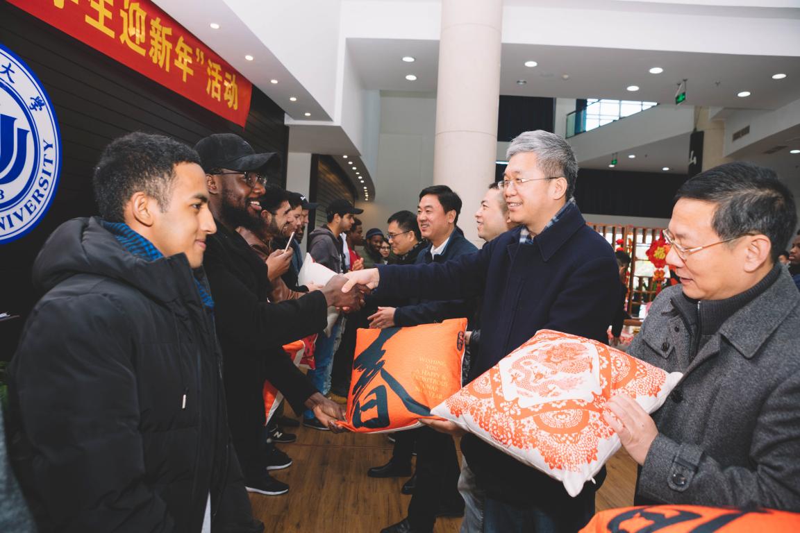 副校长钱强等与会领导和老师们为每一位国际学生代表送上猪年吉祥物,并合影留念。今天恰逢尼日利亚籍学生ZUBAIRU ISMAIL HASSAN的生日,在场师生齐唱生日快乐歌,一同为他送上生日祝福,商学院国际部主任王洪斌老师还为这位就读国际经济与贸易专业的国际学生送去生日礼物。HASSAN说,以前都是与家里人一起过生日,今天和学校的老师们、学生们一起过生日,仿佛在家一样,这个生日真是“意义非凡,终生难忘”。