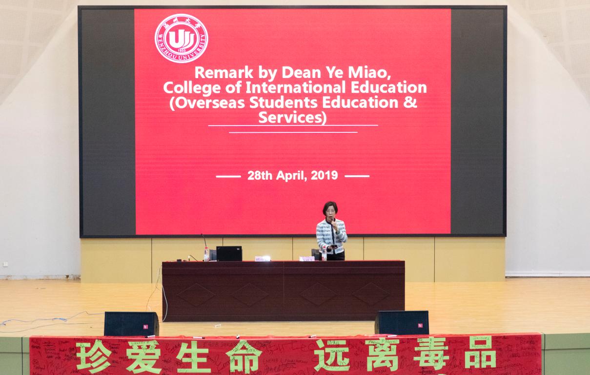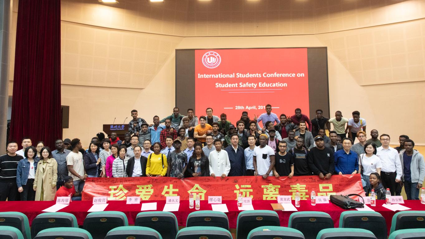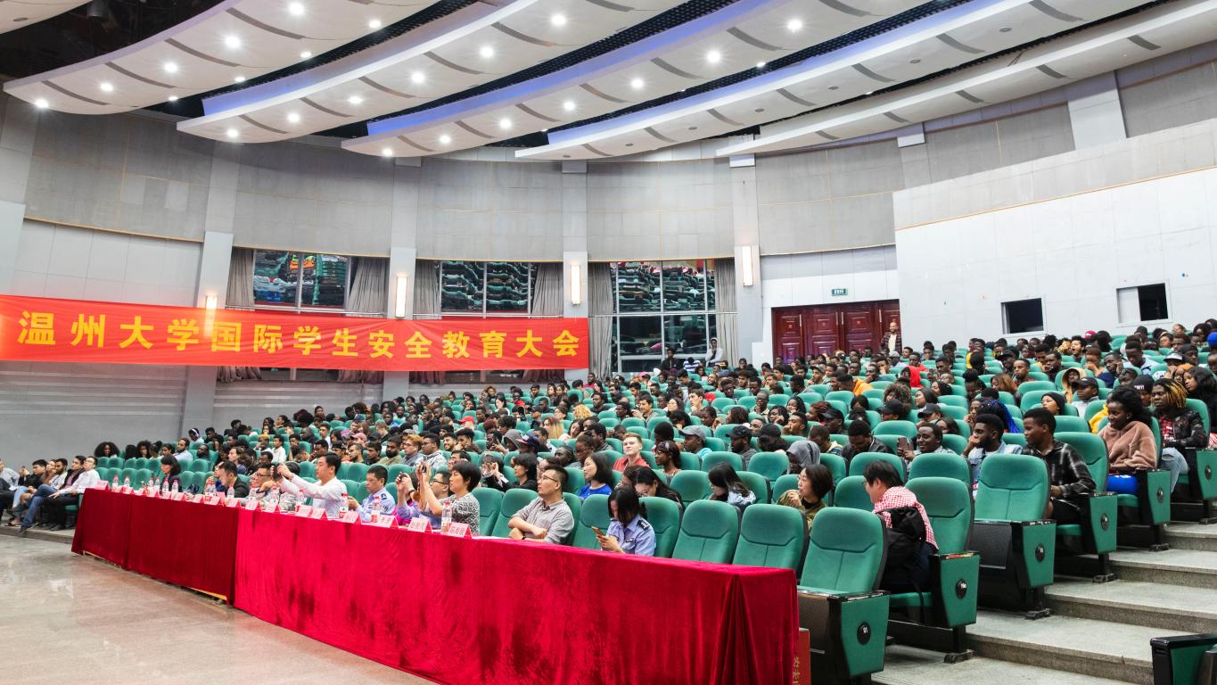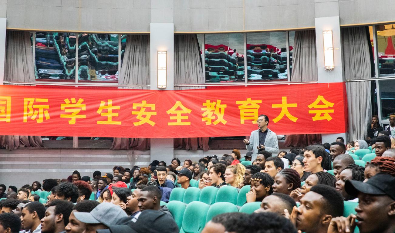 在南校区9号楼一楼报告厅召开全体国际学生安全教育大会。党委委员、副校长钱强,茶山派出所副所长黄龙武、警官陈海敏,校保卫处处长孙安梭,后勤集团公司副总经理张雪萍,国际学院(留管部)院长兼党总支书记、主任叶苗,商学院党总支副书记刘开练、法政学院副院长缪心毫、数电学院副院长朱翔鸥、生环学院副院长陈华林、机电学院党总支副书记李密,专业学院国际部主任、专员、班主任、辅导员以及600多名国际学生参会。会议由国际学院党总支副书记陈文远主持。