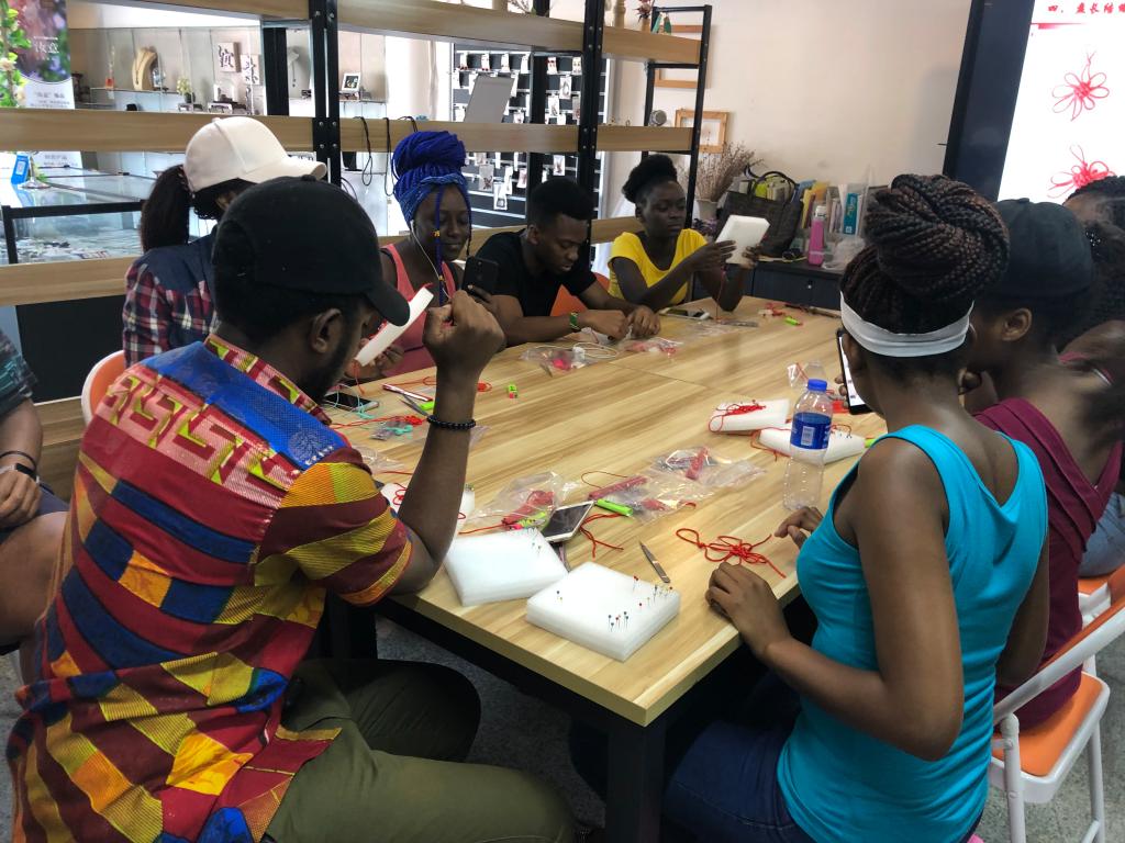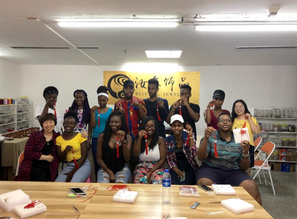 “走进温州”课堂的22位留学生们在老师的带领下来到大学生创业园的汝意饰品工作室,亲自制作了传统中国结。