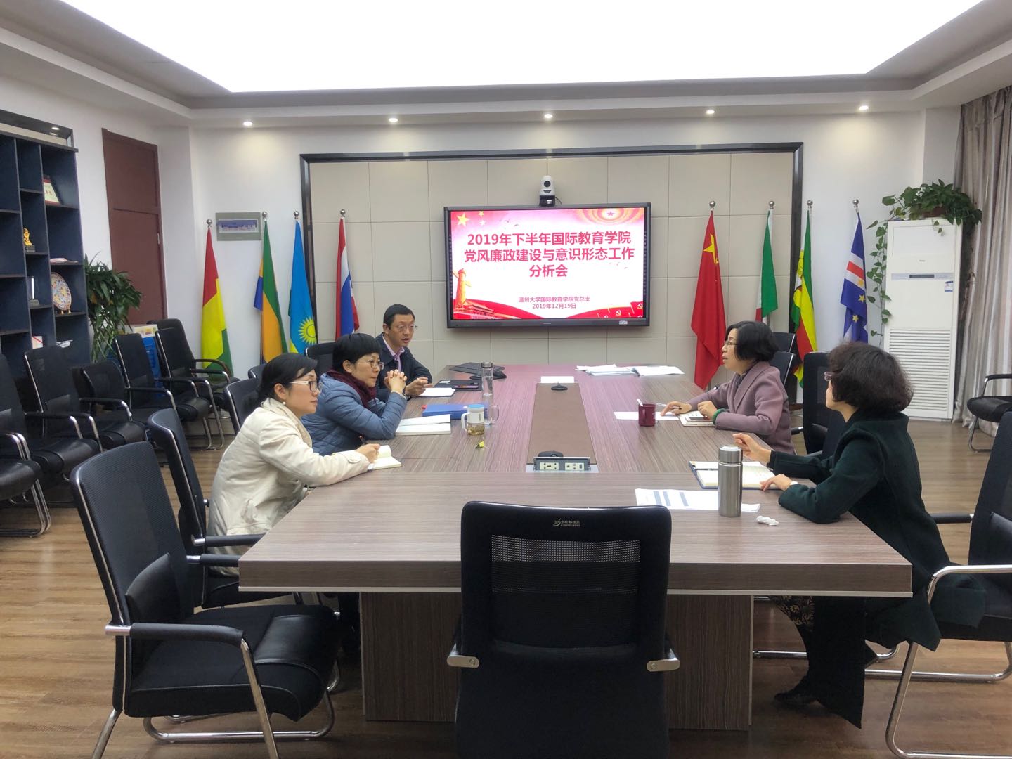 工作的重要位置,尤其是开展留学生工作,学院班子成员都要把党风廉政建设时刻记在心上,要不断加强学习,认真贯彻习近平新时代中国特色社会主义思想,学习好习近平总书记系列重要讲话和指示精神,使新时代中国特色社会主义思想进一步深入人心,落地生根,学院全体干部成员都要树牢“四个意识”,坚定“四个自信”,坚决做到“两个维护”,使党风廉政建设和意识形态工作常态化,严控廉政风险,为学院健康发展保驾护航。
