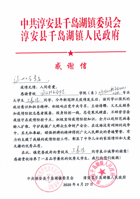 在此,镇党委政府向贵校及吕晨佳同学表示诚挚的谢意!感谢贵校培养了一名品学兼优的优秀大学生,我们向您们致敬!