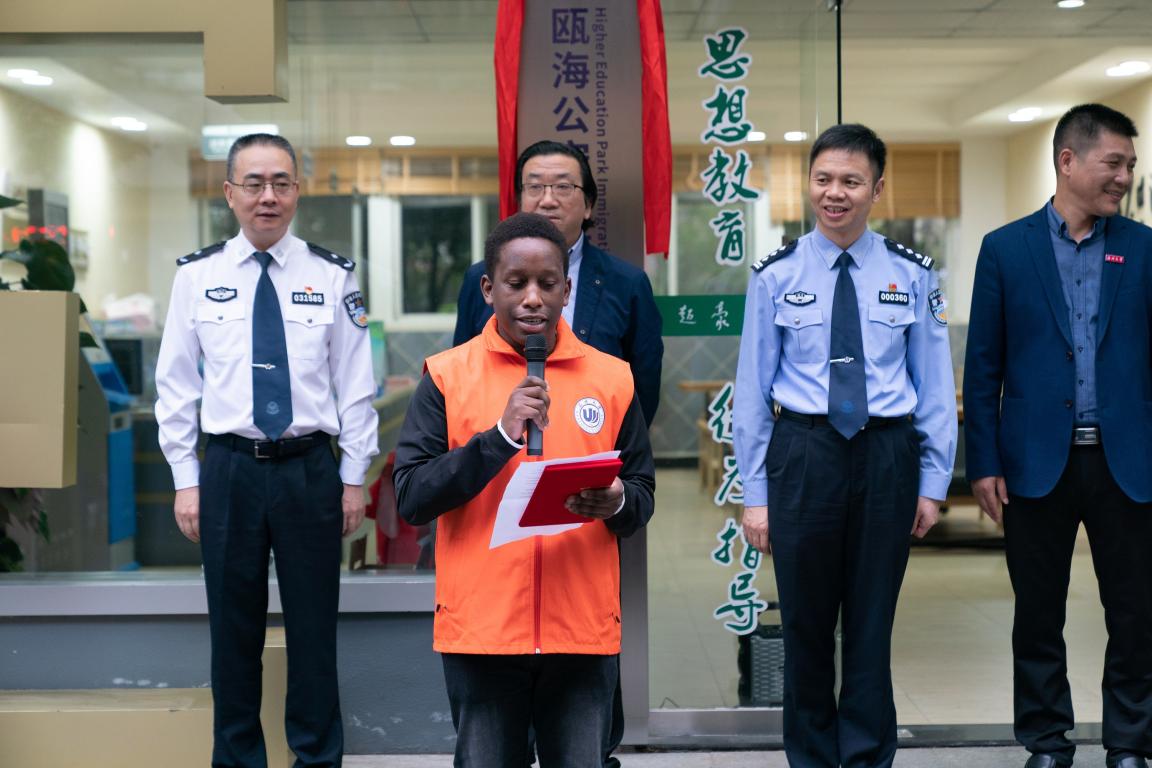 相关教师,高教园区首批受聘留学生志愿者。仪式由区公安分局党委委员、副局长郑裕军主持。