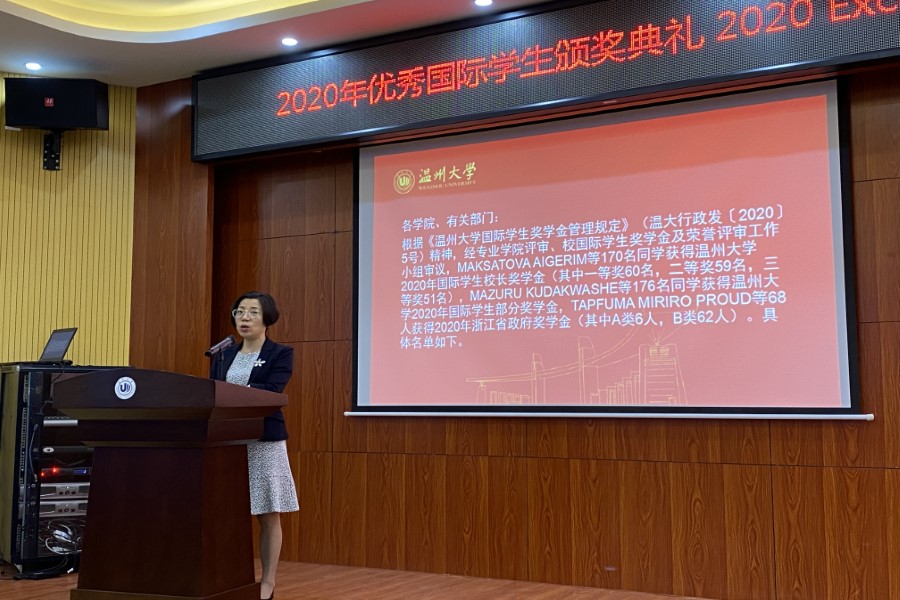 2020年校长奖学金、部分奖学金和浙江省政府奖学金获得者名单”的文件,现场奖学金获得者看到自己的名字出现在屏幕上纷纷欢呼鼓掌。嘉宾们依次为优秀国际学生们颁发奖学金证书,奖学金代表AUDREY KUFFER、NKATA AARON和APPAU DAVIS分别发表了获奖感言,鼓励大家继续努力学习,只有脚踏实地才能有所收获。看着台上获奖学生脸上灿烂的笑容,相信接下来他们会再接再厉,取得更大的进步。