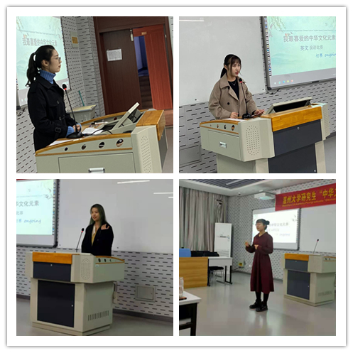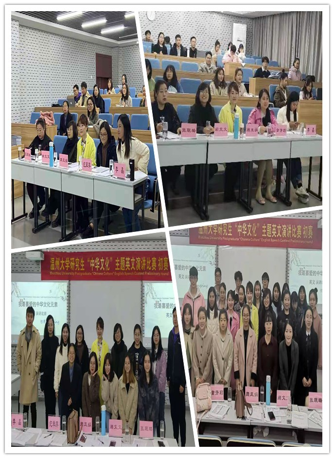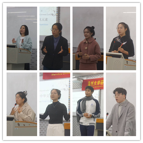 201教室举行。参赛选手以饱满的情绪讲述了自己最喜爱的中华文化元素,现场反应热烈,呈现了大学生对祖国文化的热爱。外国语学院纪翠萍老师、外国语学院周亚娟老师、外国语学院童芳莉老师、以及555电影