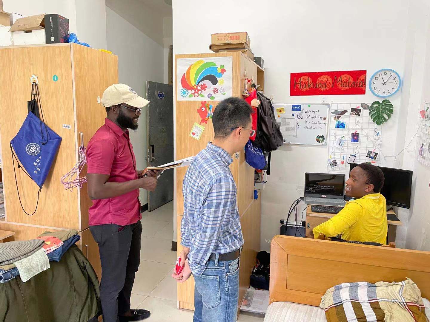 在D区学生公寓,方建晓副书记与全体辅导员一行走访国际学生寝室,询问学生假期学习和出行安排。在与学生交流过程中,方书记希望他们合理安排时间,利用五一假期好好学习汉语,学好专业知识,提升个人综合素质。在卫生状况较差、物品摆放杂乱的寝室,检查人员告知学生尽快打扫卫生,保持良好的寝室住宿环境,共同维护公共空间的干净整洁。检查人员还前往国际学生公寓厨房,提醒学生遵守安全须知,规范用电,严禁做饭期间无人看管及私拉电线等行为,做饭后及时清理厨房垃圾。