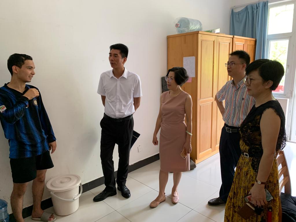 随后,检查组一行来到留学生公寓,现场查看了公寓日常值班表、留学生访客登记表。同时走进学生寝室,查看宿舍用电安全,并随机与留学生交流,了解校方对疫情防控、日常安全的宣传教育情况。