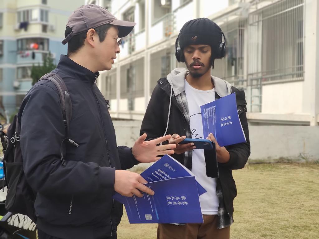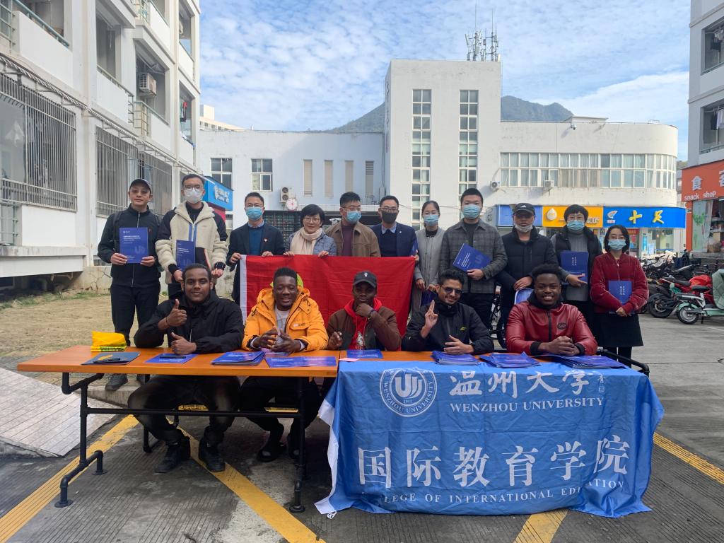 党员们手里拿着《Application Guide for Inernational Students Wenzhou University》小册子,深入国际生寝室,向国际生详细介绍了555电影