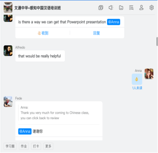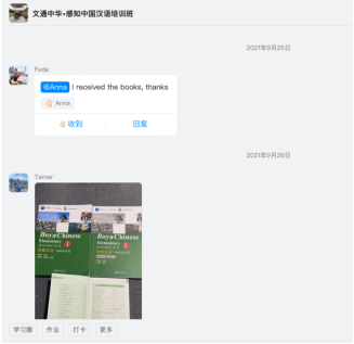 在课程设置方面,最大限度地满足不同学员的学习时间、时长需求,开设晚上班。培训课程使用腾讯视频会议软件作为授课平台,所有的课程以直播的方式开展。直播结束后由任课老师分享回放,以供学员课下复习。此外,学院为注册学员免费发放汉语书籍,帮助学生更好的学习课程。