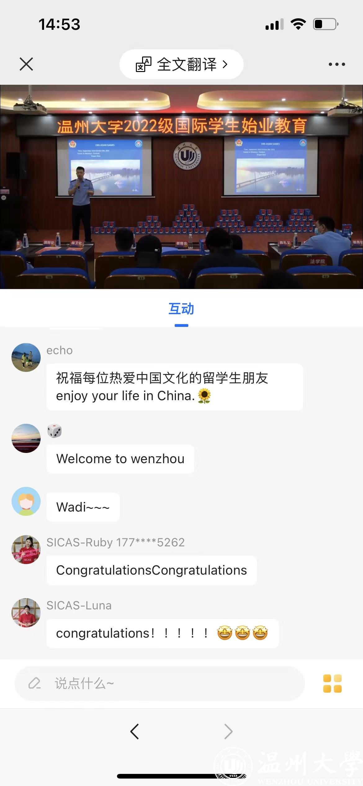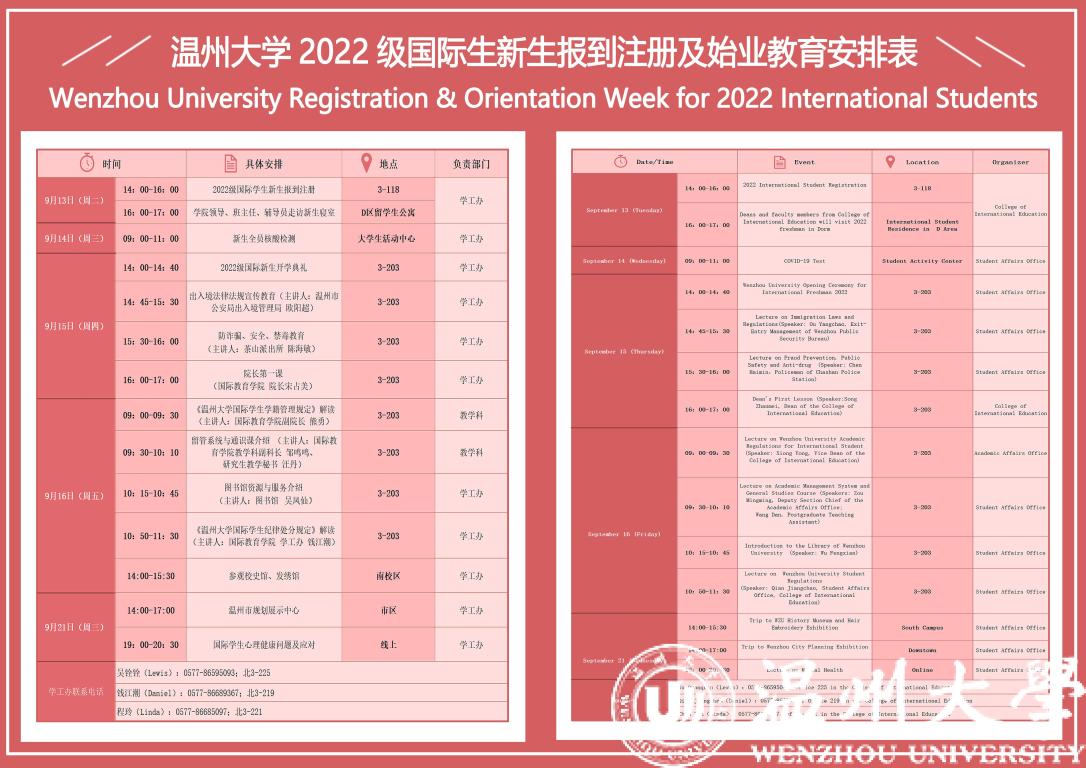 为帮助2022级国际新生全方位了解国情、校情,以全新面貌和昂扬姿态开启留学温大生活。9月15日,为期一周的2022级新生始业教育活动在开学典礼后拉开序幕。温州市出入境管理局欧阳超警官,瓯海区出入境管理大队麻晓军、陈礼义、梁佳莉警官,茶山派出所民警陈海敏,校图书馆吴凤仙,555电影