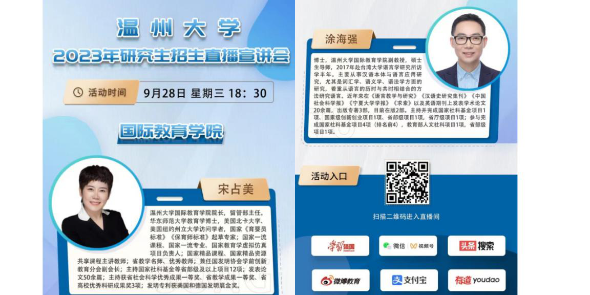 院长(留管部主任)宋占美、硕士生导师涂海强出席了本次宣讲会。宣讲会采用线上直播方式进行,直播活动通过中国教育在线考研频道、掌上考研公众号、全国研究生招生线上咨询群等中国教育在线官方平台全面推广,吸引了大量考研学子和家长观看,为555电影