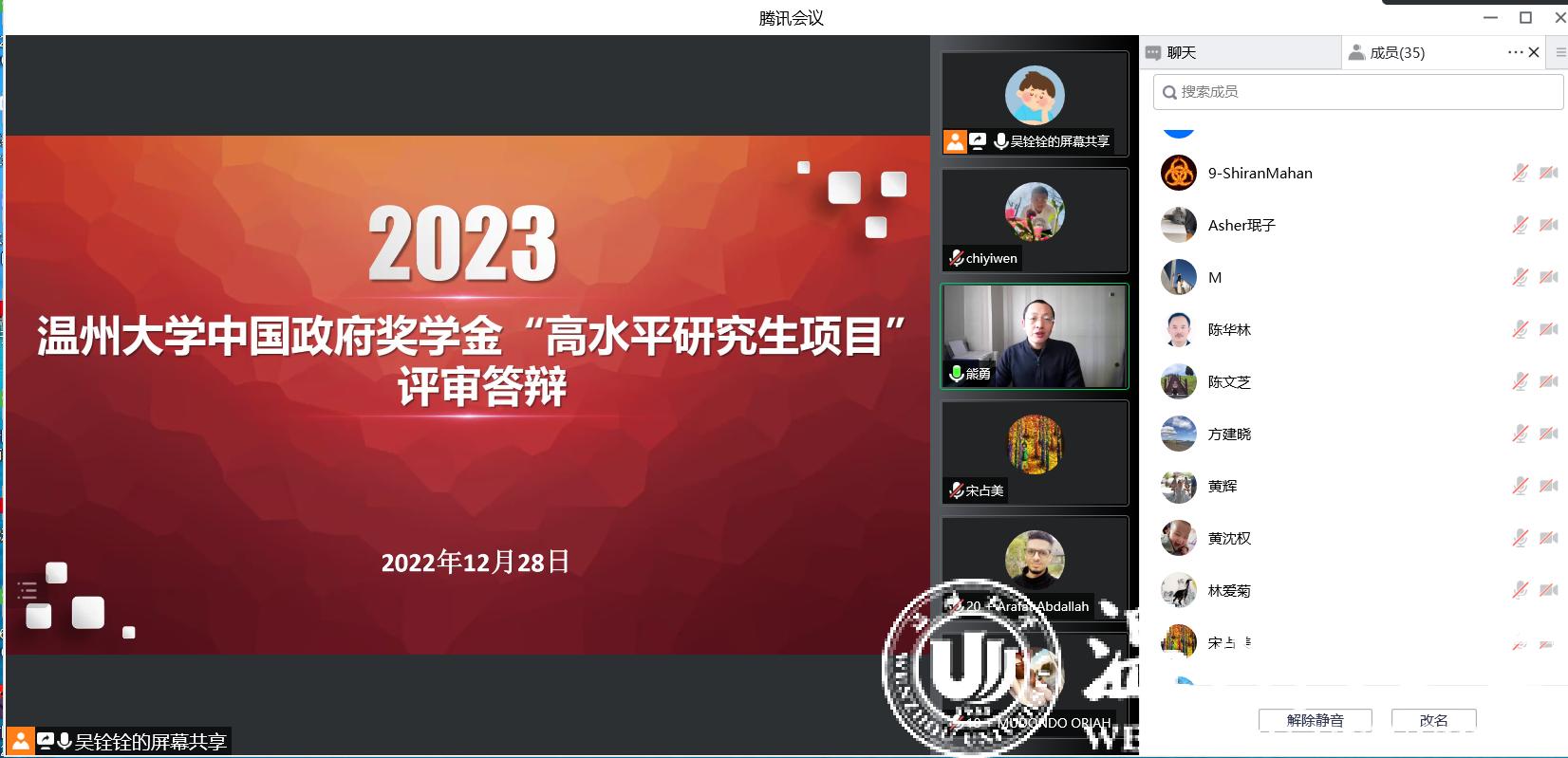 2023-2024学年中国政府奖学金“高水平研究生”项目推荐答辩会于2022年12月28日成功举办,本次答辩以线上方式进行。出席并担任答辩评委的老师有商学院副院长陈文芝、计算机学院副院长黄辉、机电学院副院长黄沈权、生环学院副院长陈华林、建工学院国际教育办公室主任赵俊亮及留管部主任宋占美、副主任林爱菊、熊勇、吴之欧、方建晓等。